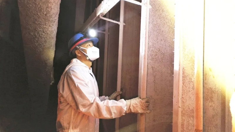 在完成通風(fēng)、氧含量和有害氣體檢測合格后,閆剛強(qiáng)“全副武裝”,對自己的勞護(hù)用品和安全工器具再一次確認(rèn),帶頭鉆進(jìn)40cm×50cm的長方形人孔門,身著密不透風(fēng)的防塵服穿梭在40℃的電場內(nèi)部。兩臺除塵器8個電場的檢查任務(wù),讓他已無暇顧及艱苦的作業(yè)環(huán)境,僅半個電場就有21排極線、22排極板、22個振打錘。每一個他都要檢查陰極線有無彎曲斷裂、陽極板有無脫槽、定位板有無脫落,振打錘有無磨損……確;芈吠暾蛯(dǎo)線連接牢固。